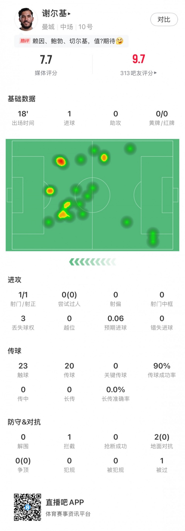 替补立功,谢尔基数据:1进球,传球20顺利率90%,评分7.7