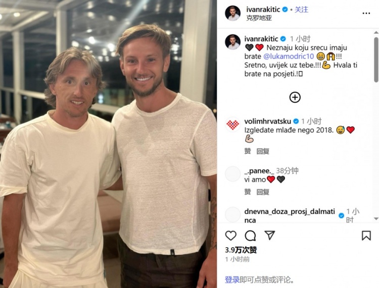 拉基蒂奇晒出与莫德里奇的合照,并配文写谈:“他们不知谈我方有多红运,兄弟@莫德里奇!!!祝你好运,恒久搭救你!!!感谢你的来访,兄弟!”