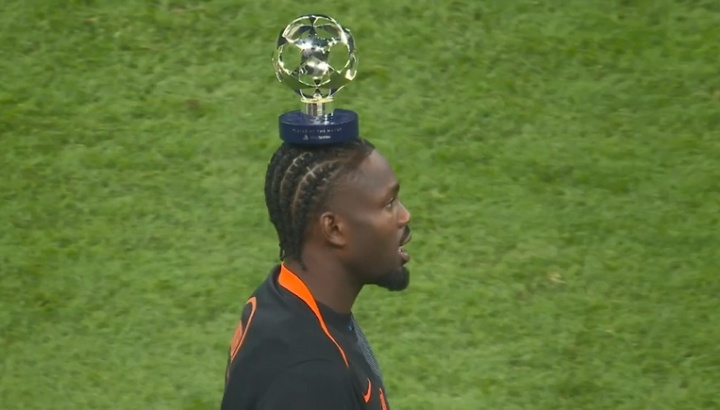 10月01日讯 欧冠联赛阶段第2轮,海外米兰主场3-0投诚布拉格斯拉维亚,赛后图拉姆当选全场最好,他还将全场最好的奖杯顶在头顶。