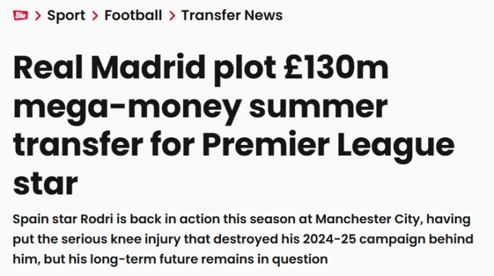 😅英媒小报:皇马策画“突袭”引进罗德里,可能报价1.3亿英镑