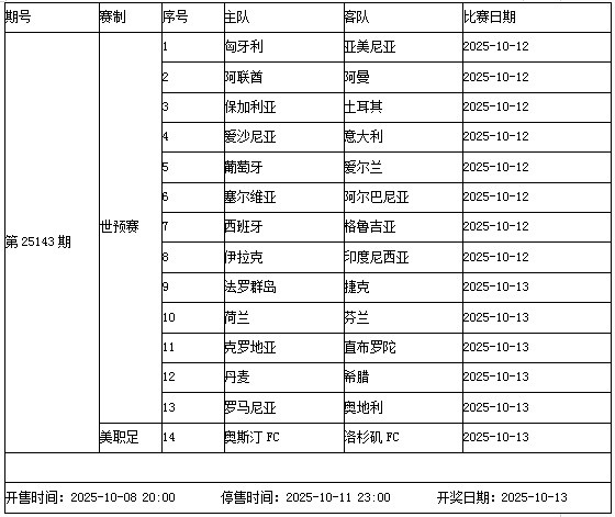 本周末,2026宇宙杯欧洲区预选赛再燃战火,权门球队纷繁出击,为宇宙杯正赛限额而战。传足赢输彩第25143期包含13场宇宙杯欧初赛与1场好意思职足,其中,意大利客场出征爱沙尼亚,葡萄牙主场对阵爱尔兰,西班牙和荷兰则辩别濒临格鲁吉亚和芬兰。