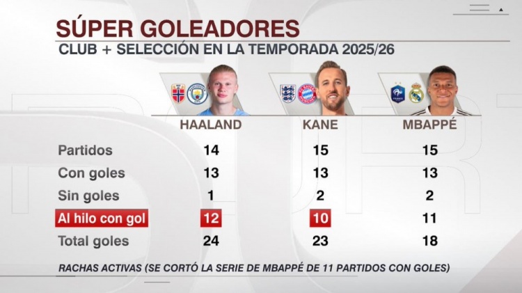 10月23日讯 ESPN统计了哈兰德、凯恩、姆巴佩本赛季俱乐部+国度队的数据,并作念出对比。