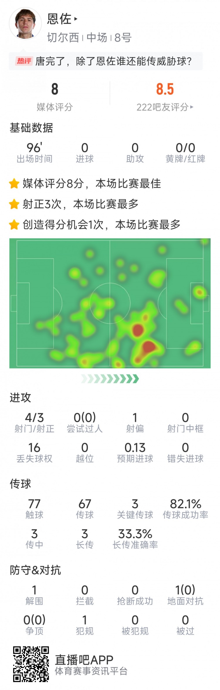 难挽败局,恩佐本场数据:3次关节传球,4射3正,评分8分全场最高
