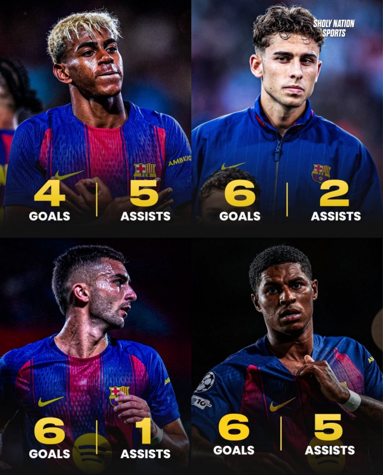 巴萨进攻端球员本赛季数据:拉什福德6球5助、亚马尔4球5助
