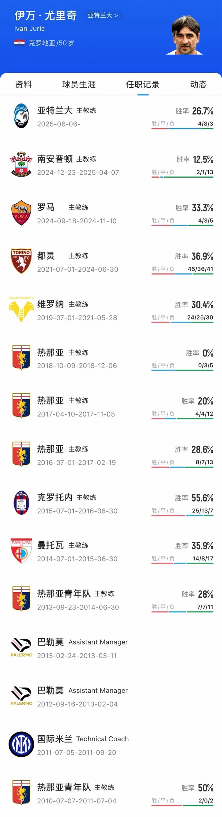昨年11月,尤里奇被罗马受命,持教时长仅53天;本年4月,尤里奇提醒南安普顿提前从英超左迁,他也在上任106天后再次下课。