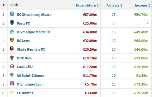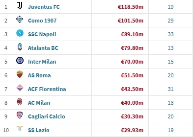 此外,勒沃库森、尤文和科莫引援破耗也都破亿,法甲现在最多的是花了8700万欧的斯特拉斯堡。