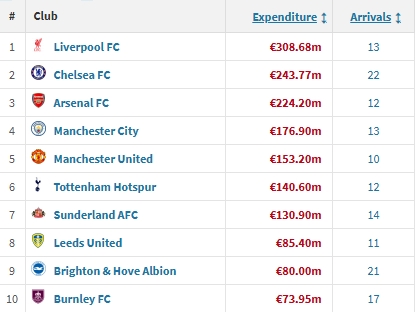 五大联赛夏窗引援破耗:英超7队破亿&利物浦3亿领跑 西甲南北极分化