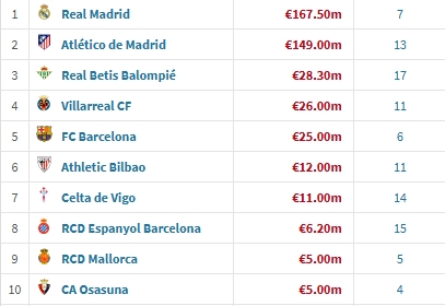 西甲则呈现严重的南北极分化,皇马和马竞的破耗分手高达1.68亿欧和1.49亿欧,第三名的贝蒂斯只花了2830万欧。