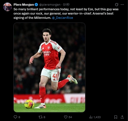 怎样吹齐不够!摩根社媒夸赖斯:阿森纳在千禧年最佳的一笔引援!