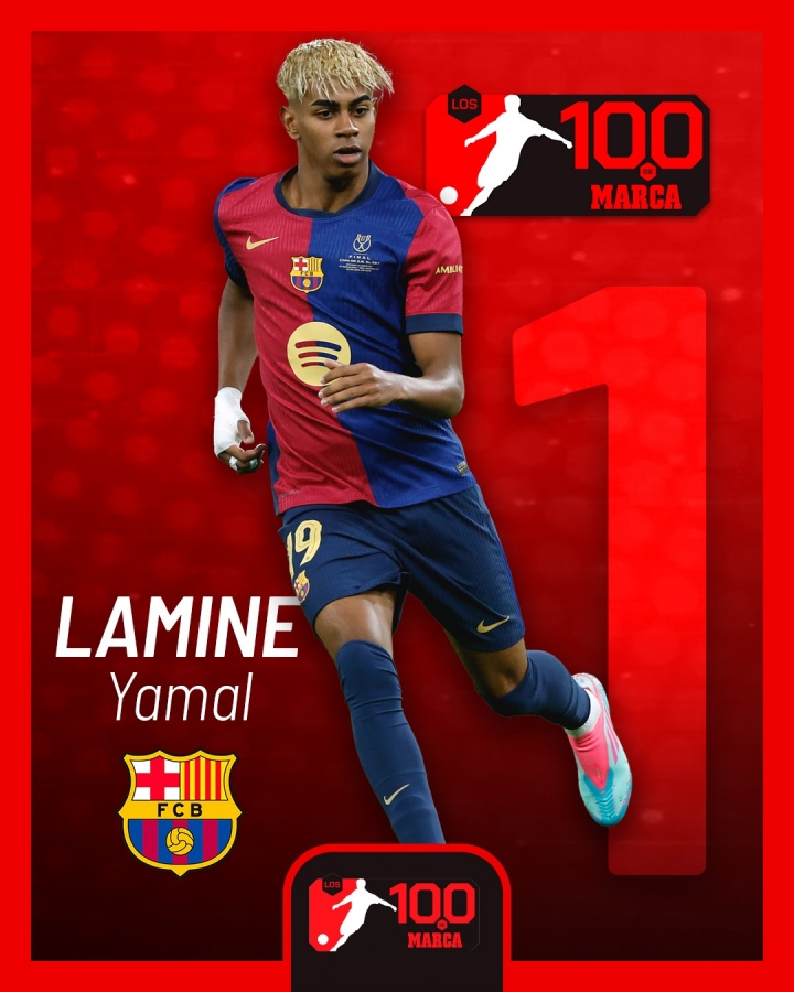 07月25日讯 西班牙媒体《马卡报》发起24/25赛季寰球足坛百大球星评比,18岁亚马尔当选赛季最好球员,以卓绝200分的上风力压登贝莱和维蒂尼亚获奖。