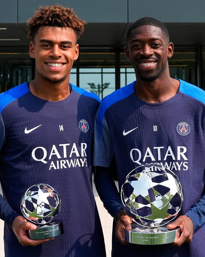 巴黎官方晒照,登贝莱、杜埃领取欧冠MVP、欧冠最好年青球员奖杯