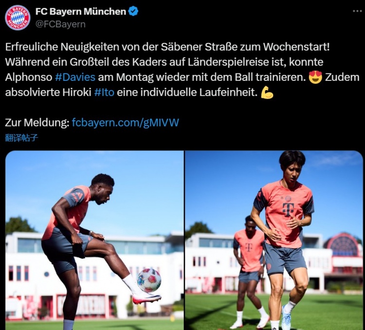 好音讯!拜仁官方:戴维斯规复有球检察,伊藤洋辉规复跑步检察