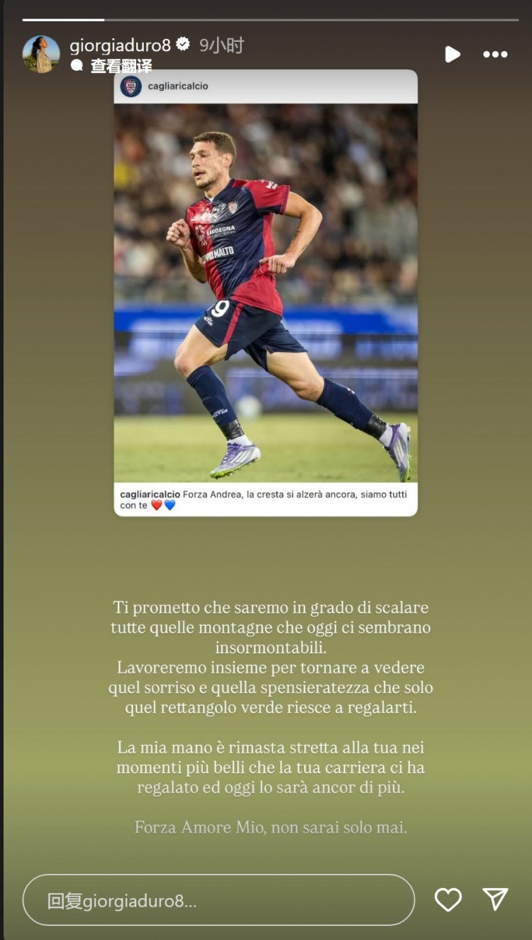 贝洛蒂的配头杜罗社媒发文:“我向你保证,咱们终将翻越那些如今看似无法跳跃的峻岭。咱们将联袂发奋,让你从头展现那抹独一绿茵场武艺赋予你的笑貌与无牵无挂。”
