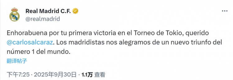 皇马官方社媒写谈:“亲爱的阿尔卡拉斯,祝愿你初度得到ATP东京站冠军,皇马球迷为天下第一的又一次夺冠感到欣喜。”