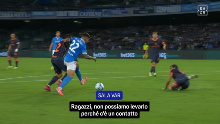 VAR: "如实,迪洛伦佐有介入,但他介入是因为一个算作……他并不是为了争取不属于球的空间而伸腿,而是为了保护球而伸腿。咱们来看一下姆希塔良的算作,稍等。望望迪洛伦佐的脸,他正保护着球。稍等一下,我在核实。”