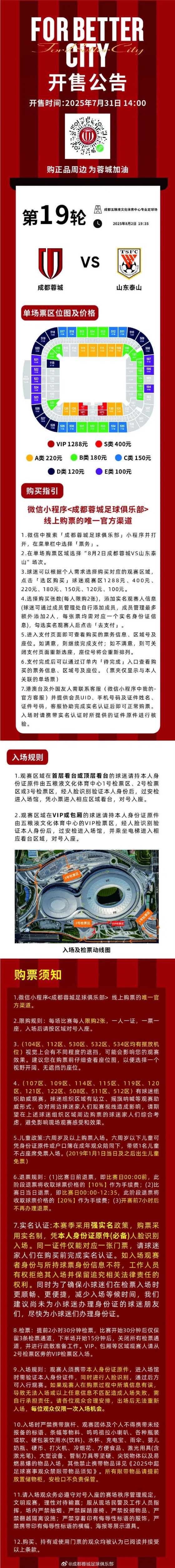 当天14:00,成皆蓉城vs山东泰山主场比赛球票线上开售,请诸君球迷家东说念主定好闹钟!线上购票关系购买应知、优惠群体计策、进场及检票花式等信息请通过图片细则了解
