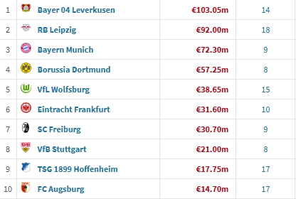 此外,勒沃库森、尤文和科莫引援破耗也都破亿,法甲当今最多的是花了8700万欧的斯特拉斯堡。