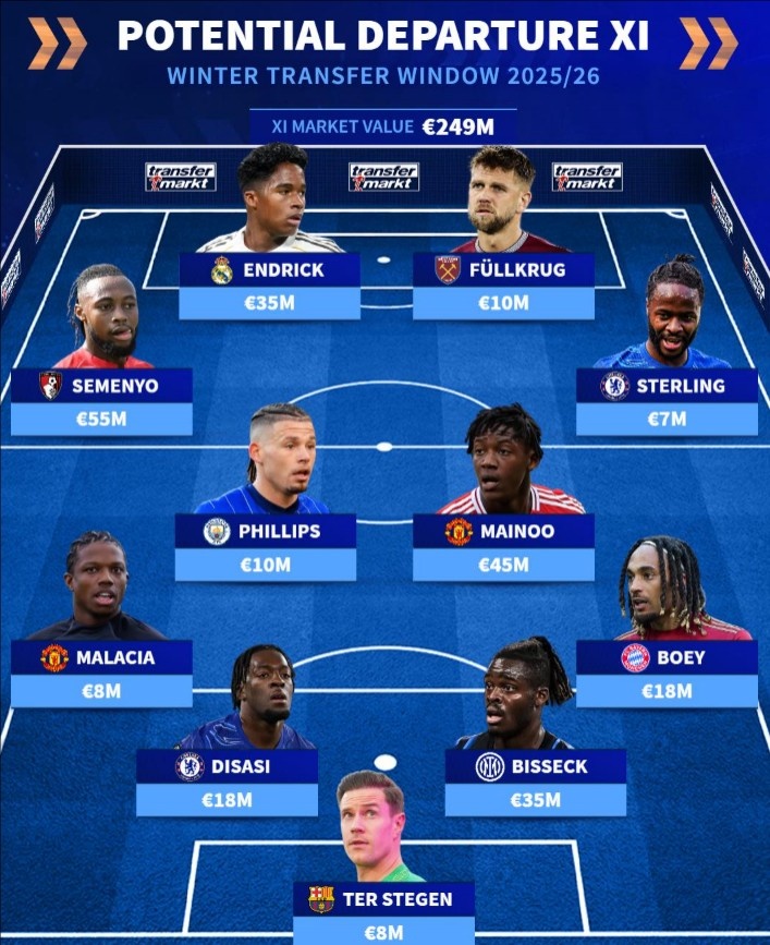 前卫:塞梅尼奥(伯恩茅斯)5500万欧、恩德里克(皇马)3500万欧、菲尔克鲁格(西汉姆联)1000万欧、斯特林(切尔西)700万欧