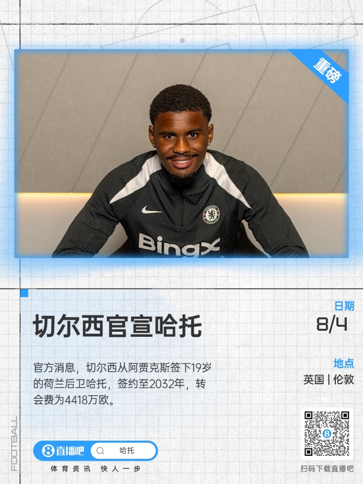 08月04日讯 官方音信,切尔西从阿贾克斯签下19岁的荷兰后卫哈托,转会费为4418万欧。