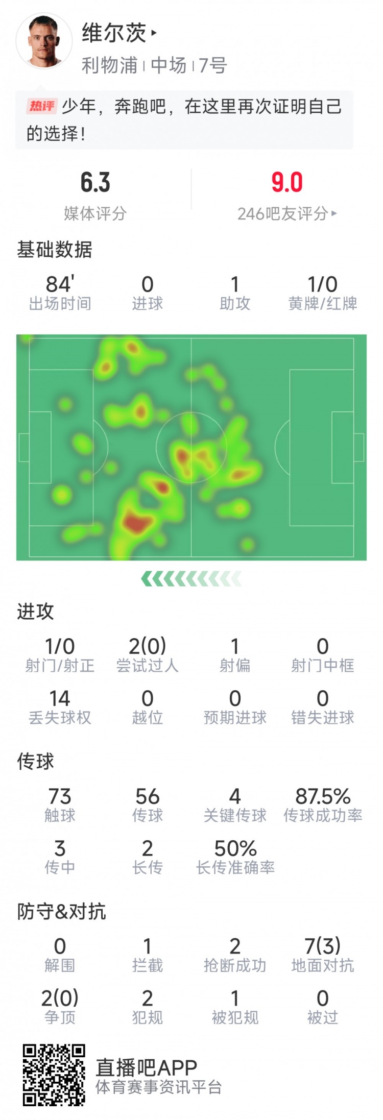 维尔茨本场数据:1次助攻,4次关键传球,2次抢断,1次射门