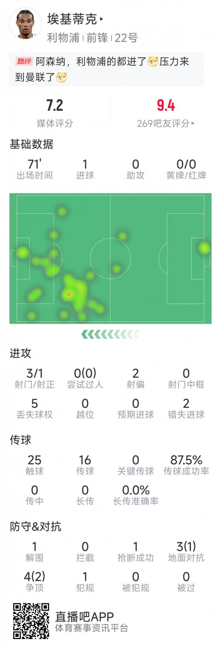 埃基蒂克本场数据:收获个人首球,3射1正,2次错失良机