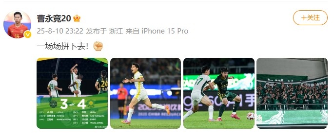 4-3逆转战胜浙江!曹永竞更新社媒:一场场拼下去!