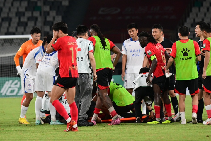中甲第20轮,苏州东吴1-1石家庄功夫。比赛第92分钟,比赛突发状况,苏州东吴球员胡靖突然倒地。
