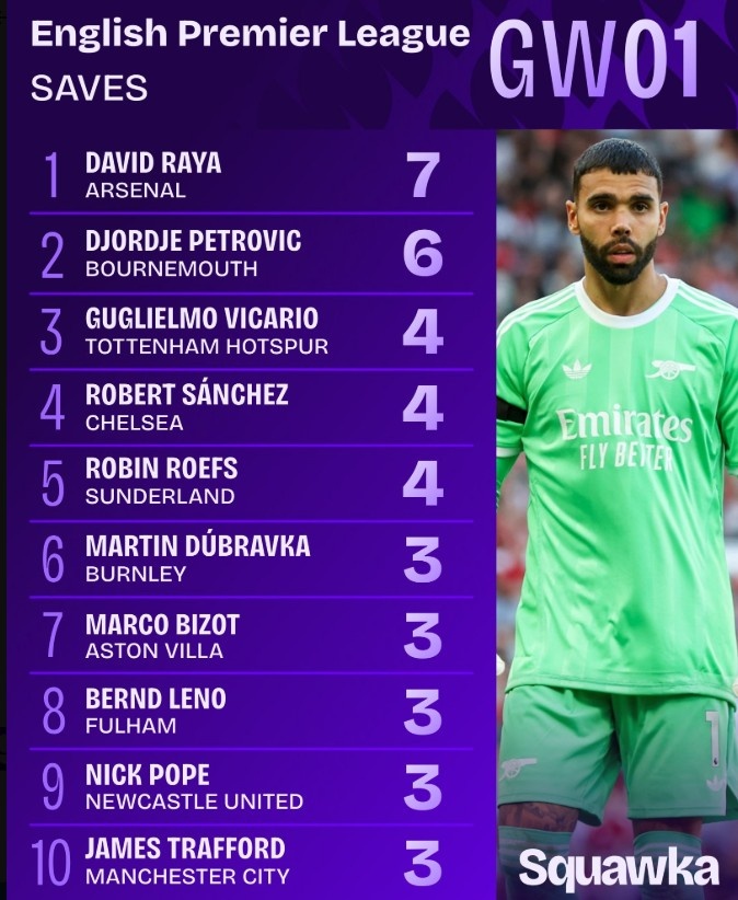 英超首轮扑救次数top10:拉亚7次居首,佩特洛维奇6次位居次席