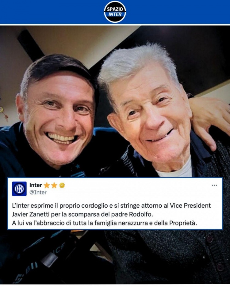 国米官方写道:“国米向副主席萨内蒂致以诚挚的哀悼,其父亲罗多尔福与世长辞。整个国米大家庭与俱乐部所有者在此艰难时刻都心系着他。”