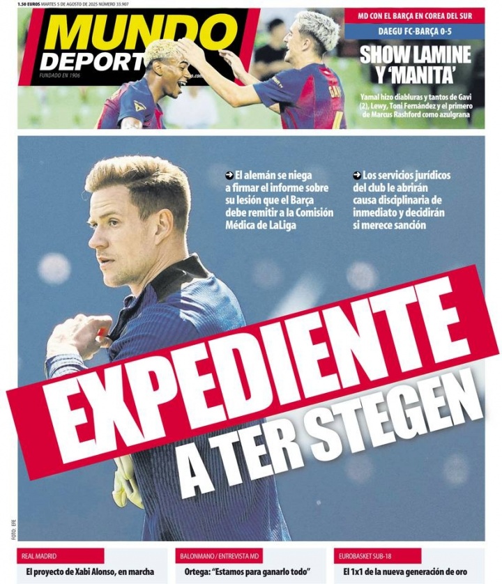08月05日讯 据《世界体育报》今日头版消息,由于特尔施特根拒绝授权俱乐部将医疗报告提交至西甲,巴萨准备对其启动纪律处分决定。