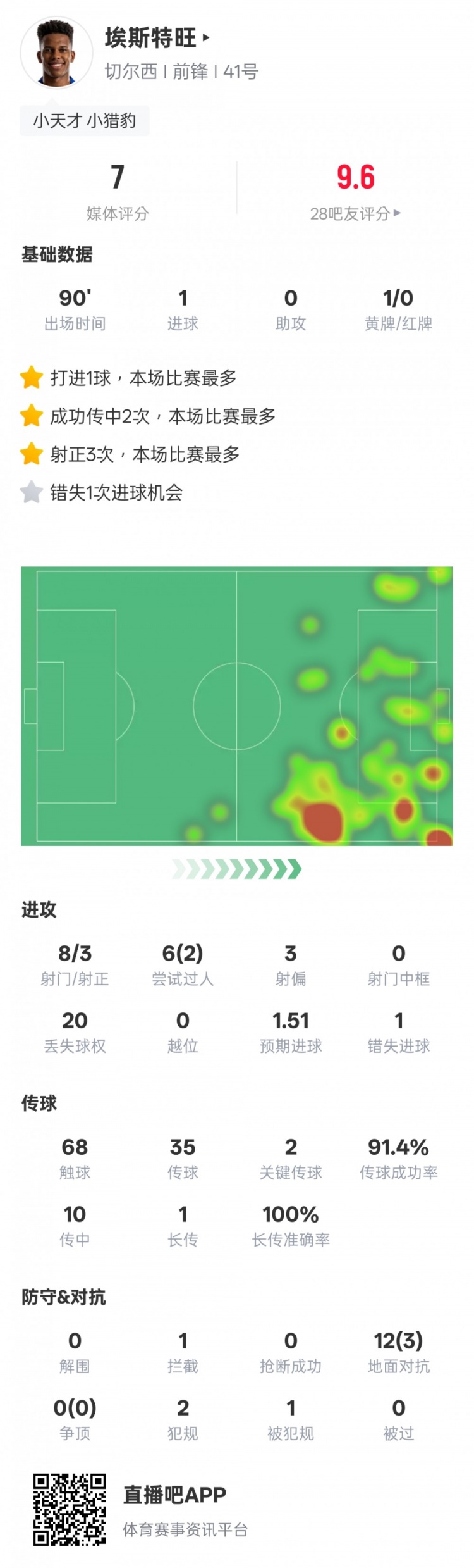 埃斯特旺本场数据:1进球2关键传球+错失1次进球机会,评分7.0