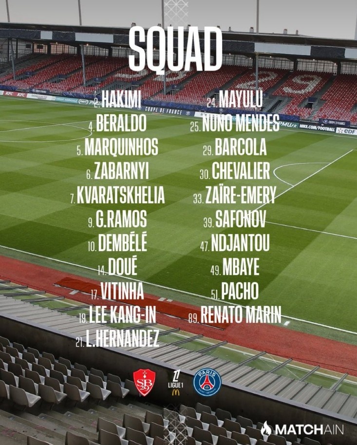 10月25日讯 本轮法甲巴黎将在客场迎战布雷斯特,球队官方也公布了本场比赛大名单,具体如下: