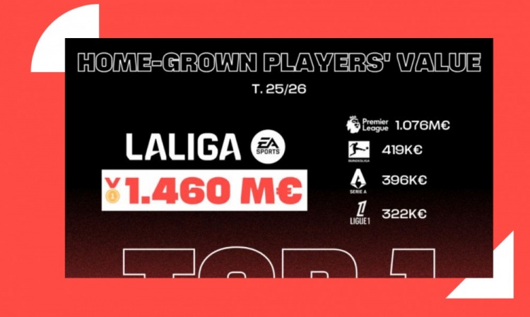 另一方面,这并未对人才保留产生负面影响。除了西甲本土球员的经济价值外,它还是给予青训营球员最多机会的联赛,在2024/25赛季,本土球员出场时间占比为19.8%,而法甲为13.5%、德甲为7%、英超为6.4%、意甲为5.5%。这些数据巩固了西班牙足球作为最佳整合本土人才的环境的地位,结合了竞技表现和经济可持续性。