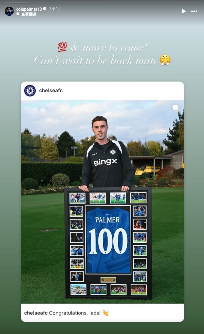 帕尔默写道:“100场!接下来还有更多!哥们我已经等不及要回归赛场了!”