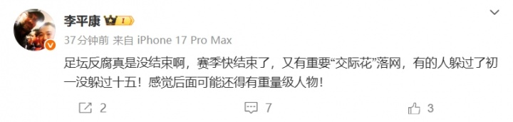 李平康:“足坛反腐真是没结束啊,赛季快结束了,又有重要“交际花”落网,有的人躲过了初一没躲过十五!感觉后面可能还得有重量级人物!”