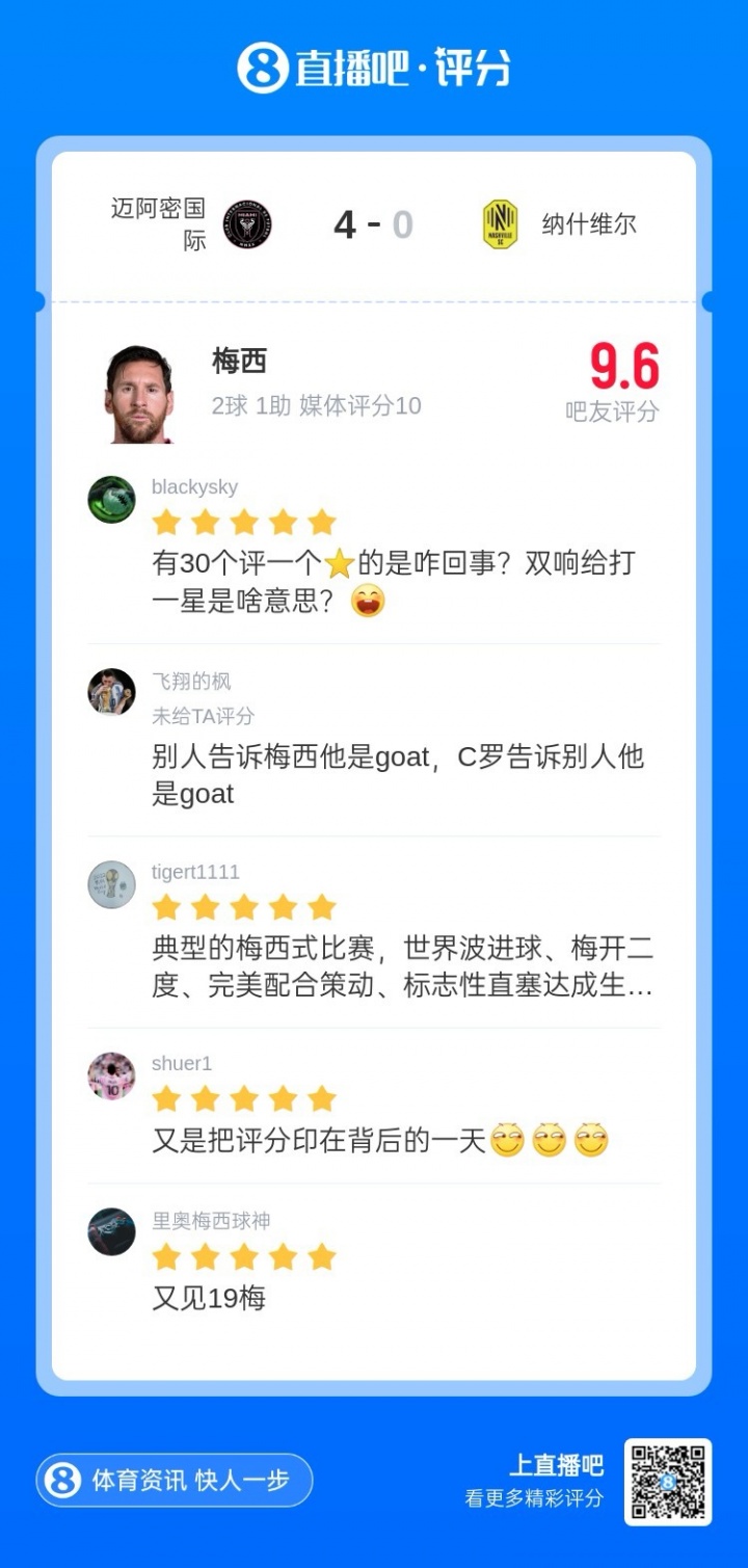 超过3600名吧友给梅西评分,目前评分为9.6,94.5%五星,4.9%一星。