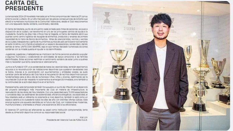 瓦伦西亚俱乐部主席Kiat Lim(林荣福儿子)在即将召开的股东大会前,向俱乐部股东们发布了一封包含在非经济管理报告中的信。在这封信中,Kiat Lim谈到了俱乐部和球迷在DANA灾害期间展现的团结精神,以及搬迁至新梅斯塔利亚球场对未来的重要性。