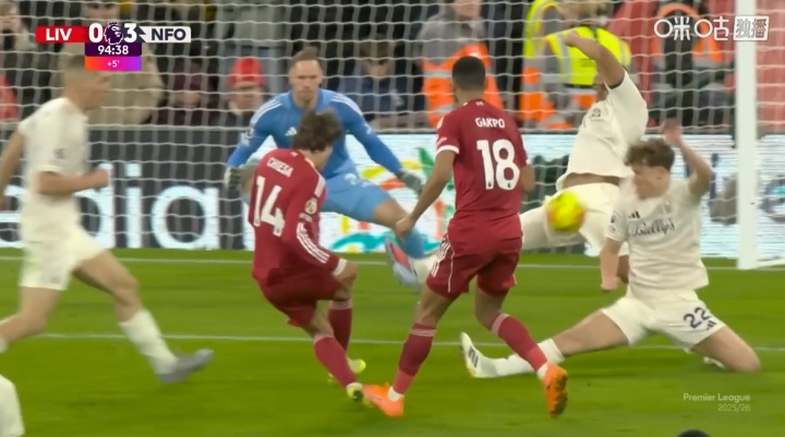 11月23日讯 在利物浦0-3不敌诺丁汉森林的补时最后时刻,基耶萨近距离抽射,被本场的进球功臣穆里略用裆部挡出。