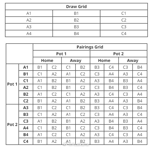 这次抽签东西亚区仍将分开进行。抽签时,将当先从1号种子里混抽详情A1、B1、C1、A2、B2、C2的球队,1号种子球队一起抽完后,再从2号种子里混抽详情A3、B3、C3、A4、B4、C4的球队。同期,抽签还将恪守同协会藏匿的原则,即来自吞并协会的球队将不会在瑞士轮阶段进行比赛,若是偶合抽到,将会手动蜕变到下一个签位。