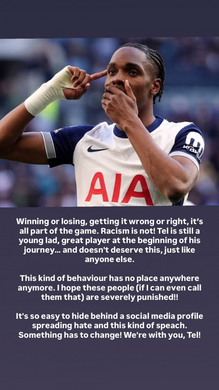 理查利森写谈:“胜败乃兵家常事,对错都为比赛的一部分,但种族目标毫不是!特尔还是个年青球员,正处在办事生活的起步阶段...他和任何东谈主雷同,都不该际遇这种对待。”