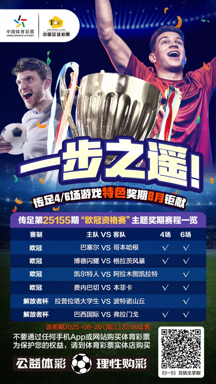 第25155期传足4/6场游戏特点奖期依然于2025年8月17日20:00开售,将于2025年8月20日22:00停售,并于8月21日开奖,其中巴塞尔VS哥本哈根、博德明慧VS格拉茨风暴、费内巴切VS本菲卡、巴西外洋VS弗拉门戈为4场进球游戏竞猜赛事。