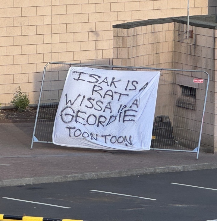 口号上写着,Isak is a rat, Wissa is a Geordie, Toon Toon.(翻译参考:伊萨克是叛徒,维萨是自家东说念主,纽卡!纽卡!)