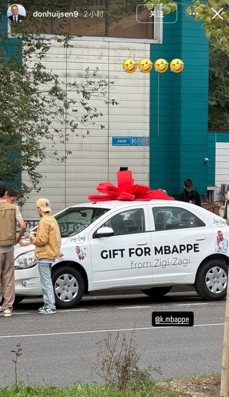像片中阿拉木图街头泊岸着一辆喷有姆巴佩涂鸦的汽车,唐纳德-赫伊森也将这张像片@了姆巴佩,并附上4个“笑哭”神采。