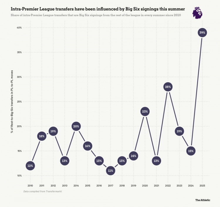 本年夏窗,39%的英超里面转会属于“BIG6”从联赛其他球队收购球员——这是自2010年以来的最高比例。