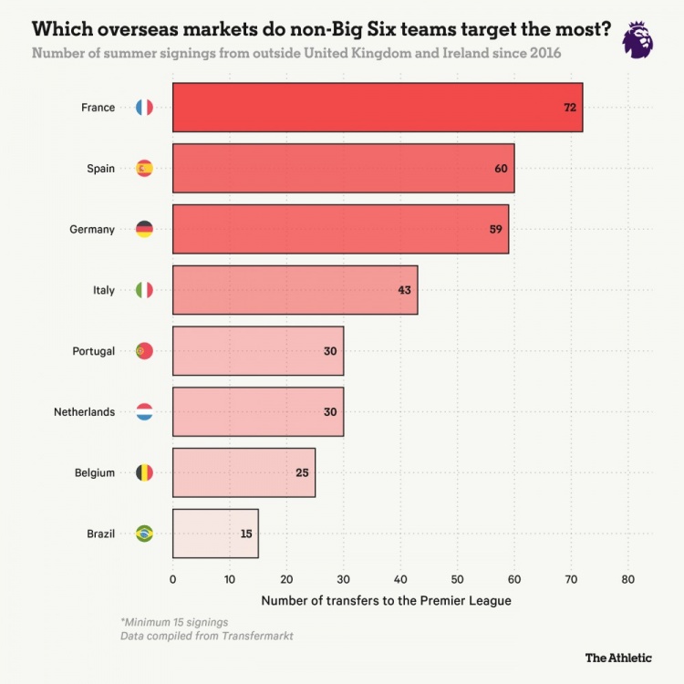 自2016年以来,非“BIG6”球队不绝从欧洲主要联赛引援,其中法甲最多(72东说念主登陆英超),其次是西甲(60东说念主)、德甲(59东说念主)和意甲(43东说念主)。