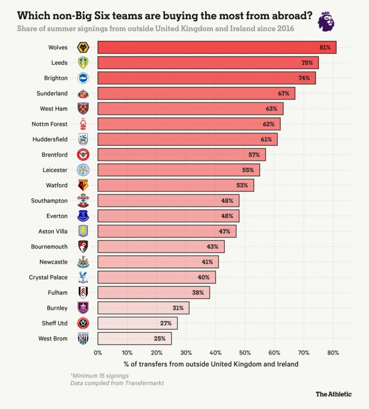 排在他们前边的是利兹联(75%),他们今夏已从国外签下六名球员;以及狼队(81%),自2018年升超后一直专注于引进葡萄牙球员。