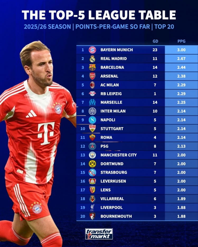 本赛季五大联赛场均拿分榜:拜仁3分拿满 皇萨枪列前四、巴黎第12