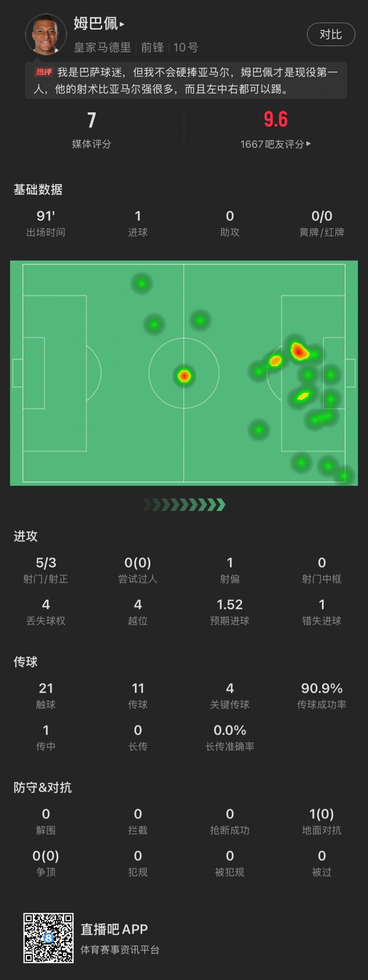 10月27日讯 皇马2-1巴萨,为止国度德比四连败。姆巴佩破门+失点+两球被吹,第90分钟被换下。