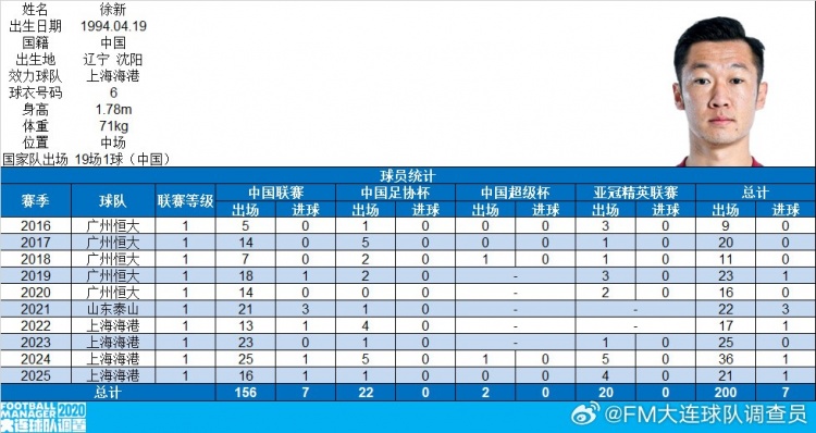 徐新完成中国俱乐部各项职业赛事出战200场,共打入7球