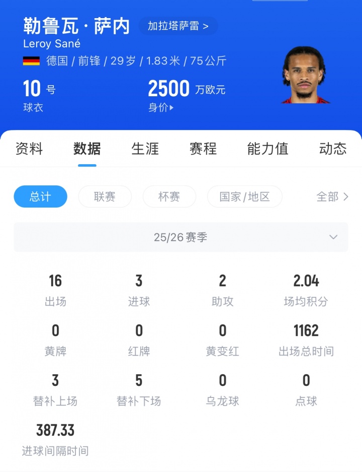本赛季萨内代表加拉塔萨雷出战16场比赛,孝顺3粒进球和2次助攻,其中土超11轮3球1助。
